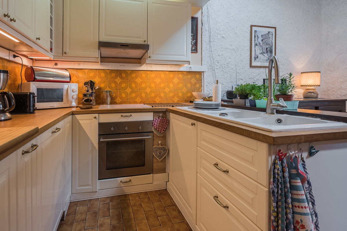 Lave linge, lave vaisselle, congélateur, micro-onde, four, réfrigérateur, cafetière, vaisselle et couverts, plaque de cuisson, ustensiles de cuisine