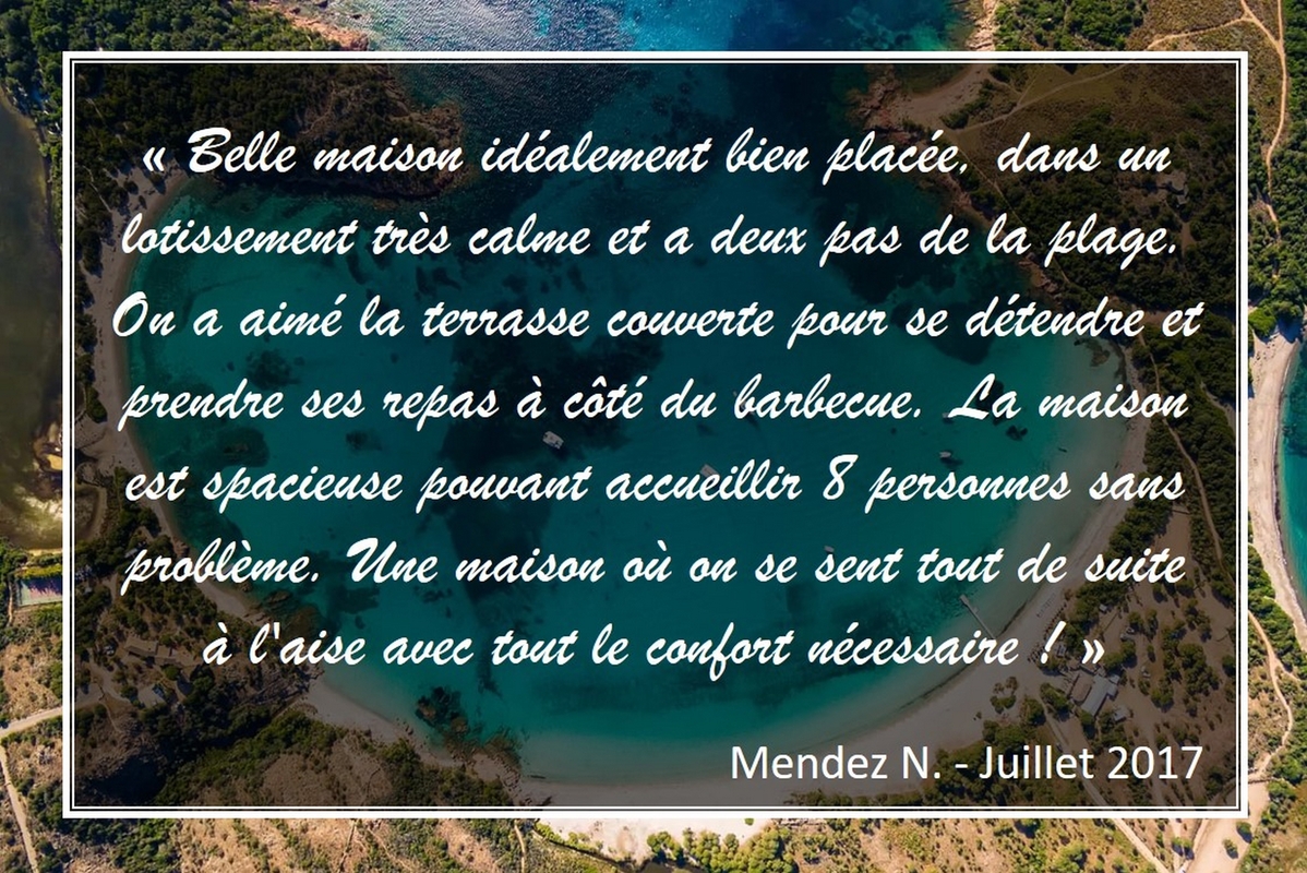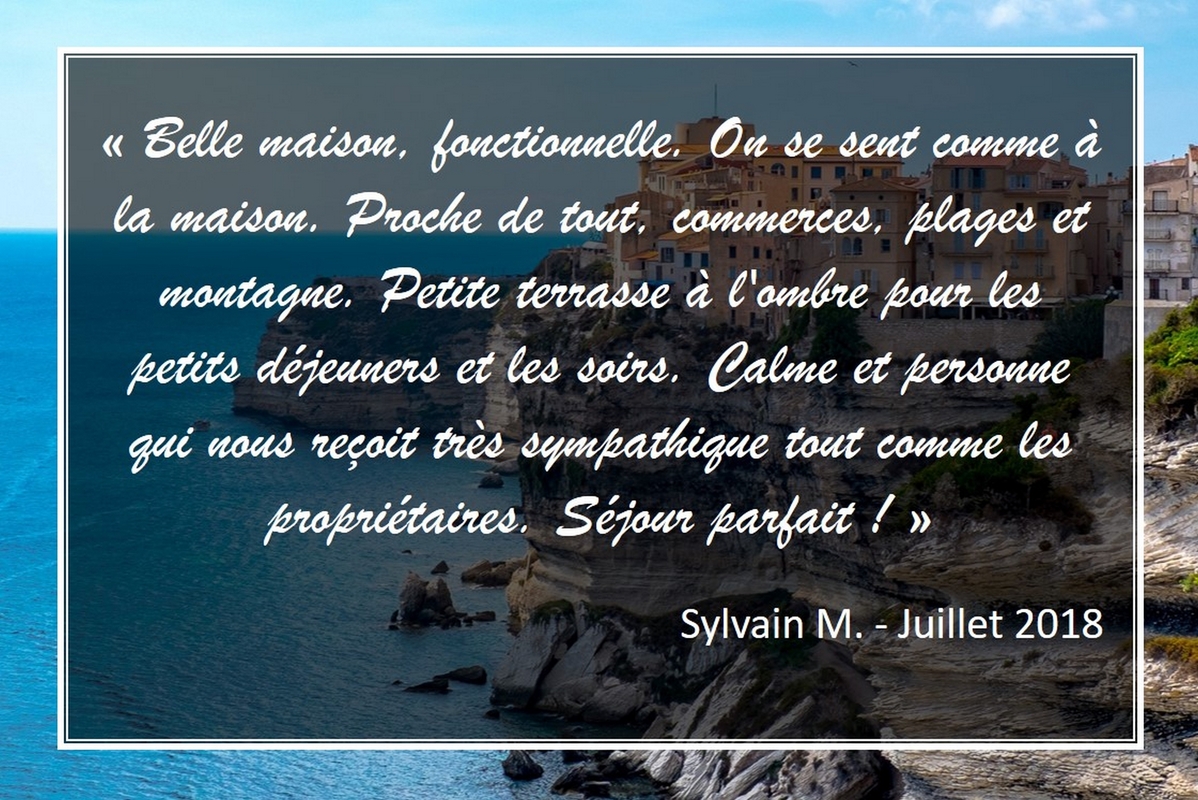 À un pas de la mer et de la plage, « Occimara » n’attend que vous pour de délicieuses vacances sur l’Ile de Beauté avec ses quatre chambres climatisées et des espaces communs conviviaux parfaitement équipés pour passer de bons moments avec jeux de société, livres, TV, documentation touristique, DVD, cheminée…