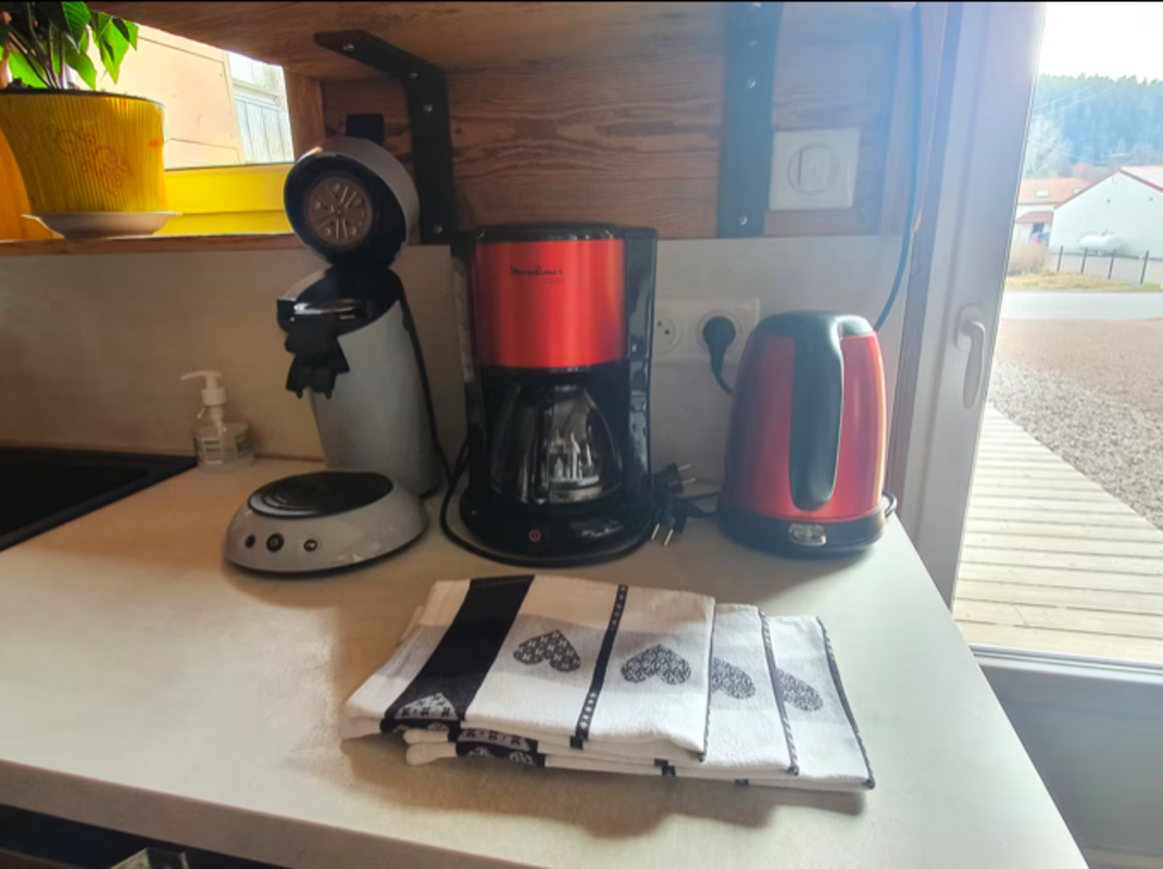 Congélateur, micro-onde, four, réfrigérateur, cafetière, bouilloire, vaisselle et couverts, plaque de cuisson