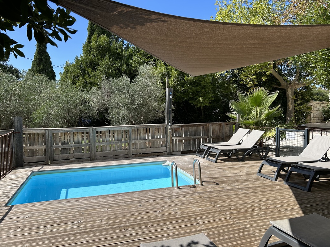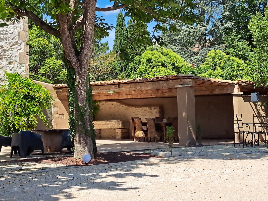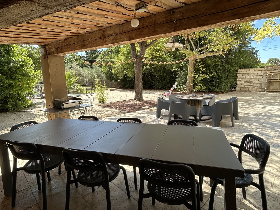 Grande, charmante et confortable maison avec jardin d'environ 1500 m2 arboré avec champ d'oliviers et belle terrasse de 225 m2 ombragée par un platane, un marronnier et divers arbustes, terrasse couverte avec salons de jardin et planche professionnelle.