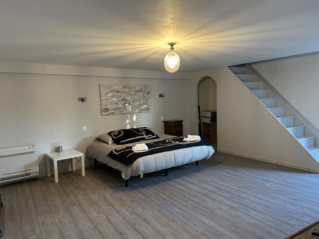 Chambre avec 1 lit 2 personnes 160x200 cm, placards, bureau et cheminée d'ornement .