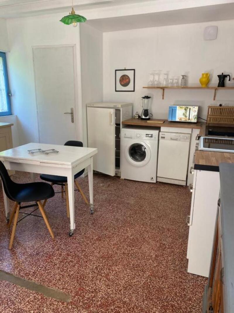 Lave linge, lave vaisselle, congélateur, micro-onde, four, réfrigérateur, cafetière, vaisselle et couverts, plaque de cuisson