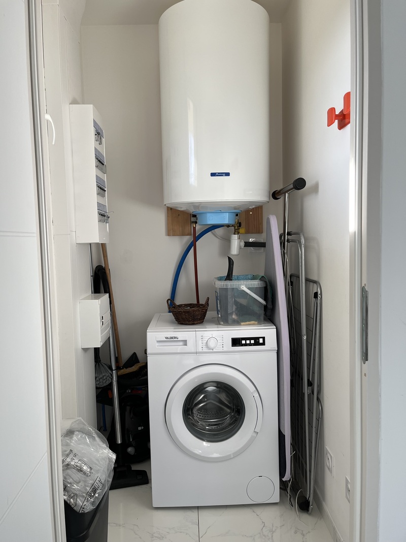 Congélateur, micro-onde, four, cafetière, vaisselle et couverts, plaque de cuisson