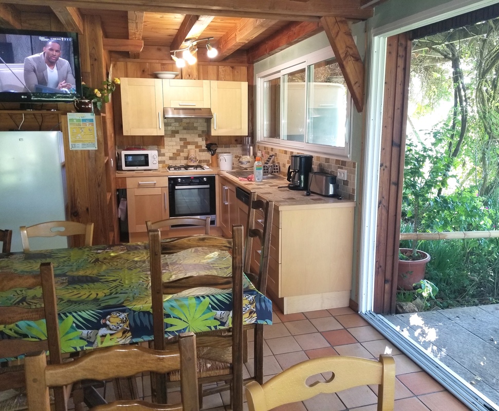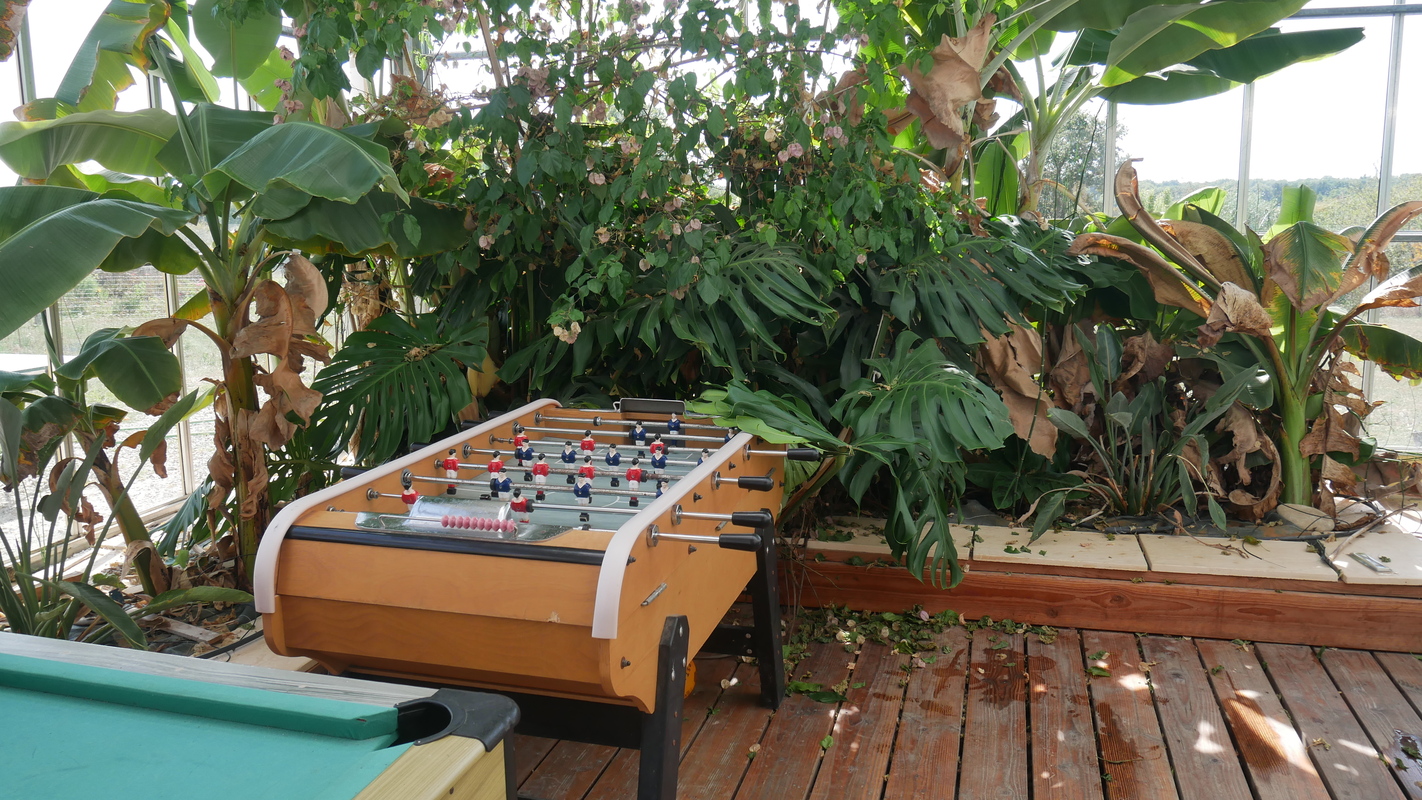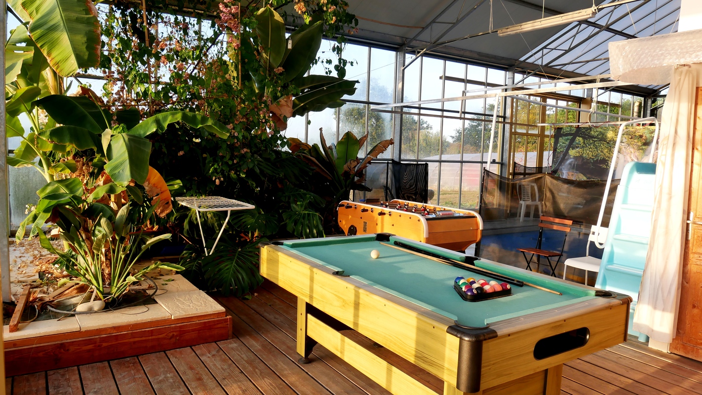 La piscine est couverte et l'eau est chauffée toute l'année à 28 °C . Elle est située dans une grande Verrière avec jardin d'hiver chauffé par le soleil, il y a aussi un billard et 1 baby foot dans cet espace lumineux. l’accès se fait par un parking d'environ 10 places.