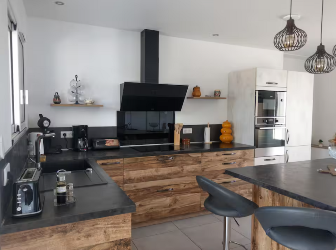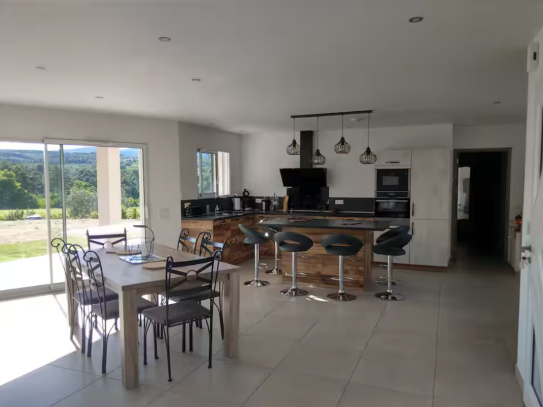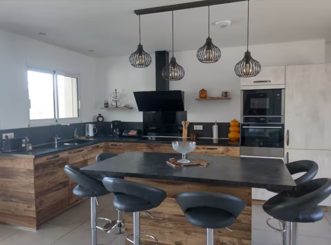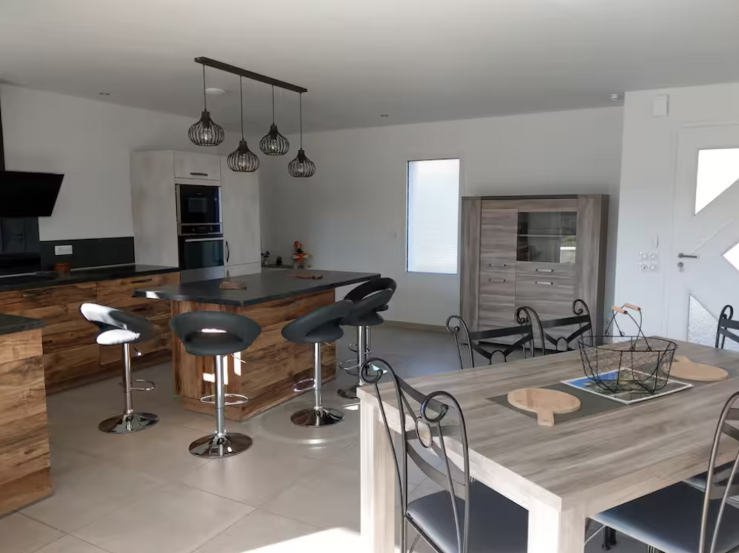 Vous profiterez d’une spacieuse pièce de vie de 60 m², lumineuse et conviviale, avec une cuisine entièrement équipée pour cuisiner comme à la maison.