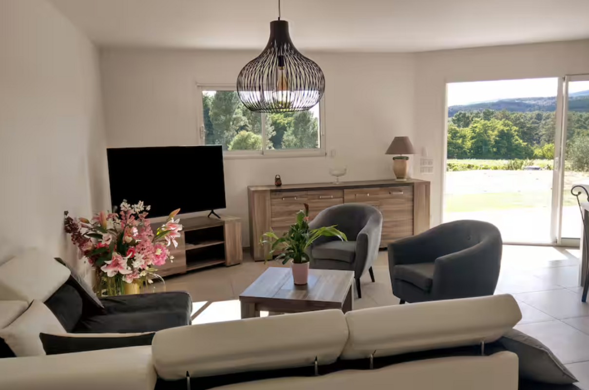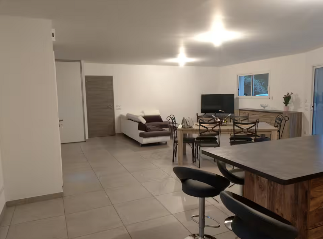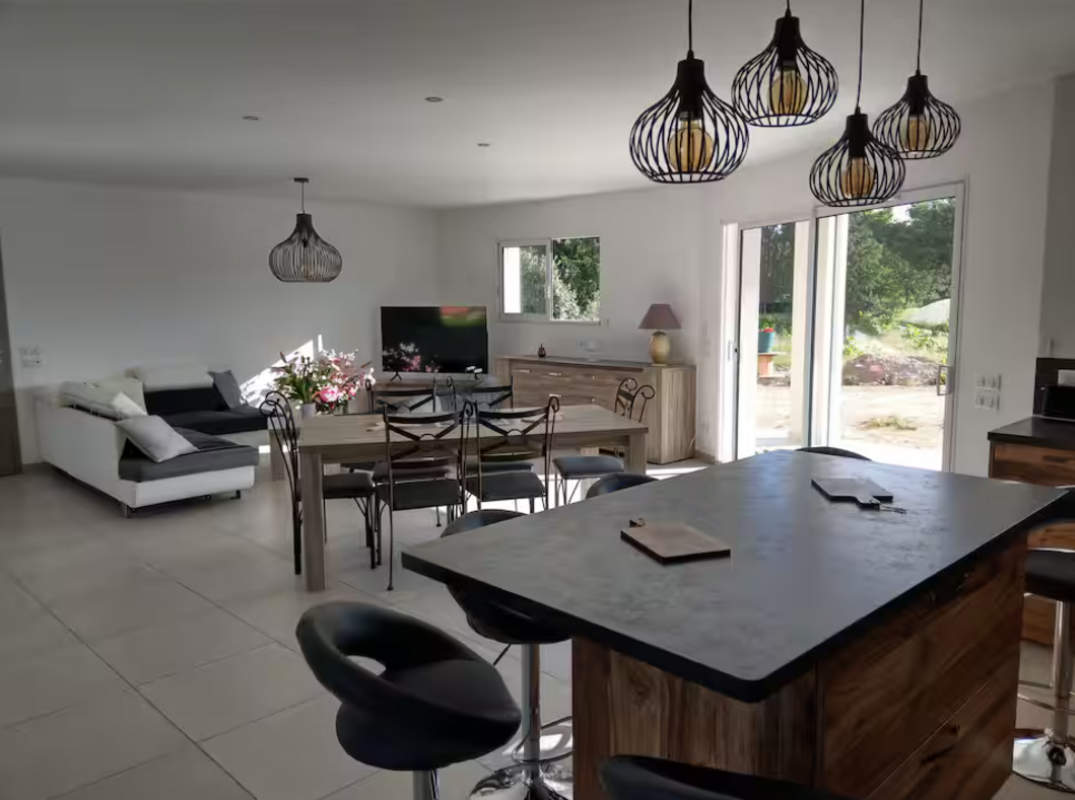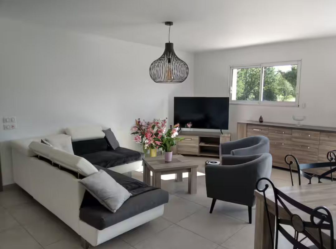 Vous profiterez d’une spacieuse pièce de vie de 60 m², lumineuse et conviviale, avec une cuisine entièrement équipée pour cuisiner comme à la maison.