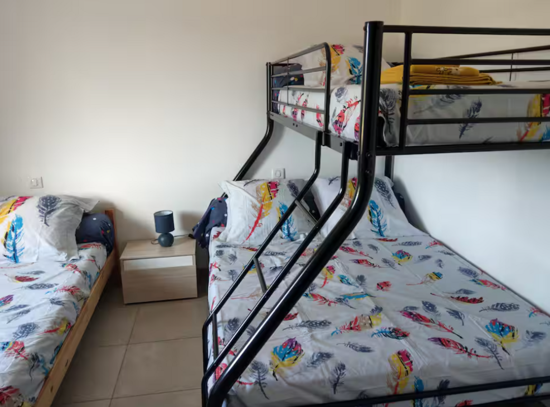 - une troisième chambre comprenant un lit 140x190 ainsi que deux lits 90, également équipée d’une penderie.